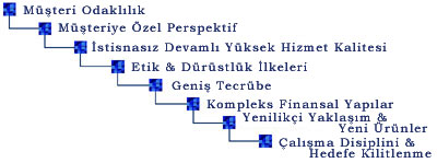 “Yüksek ahlak ve profesyonellik kuralları çerçevesinde seçkin müşterilerini ve onların projelerini, halka açık olmayan sermaye ve borç piyasalarından finansman sağlamaları için, uluslararası mali piyasalarda temsil etmek, bu piyasaları maksimize etmesini sağlamak sureti ile kurumsal finansman hizmeti vermektir ”.